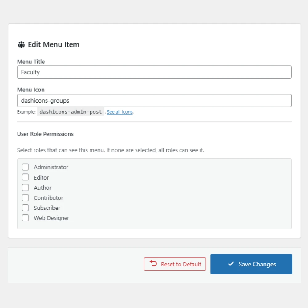 - ✏️ Ganti Nama & Ikon: Ubah nama menu apa pun agar lebih sesuai dengan kebutuhan Anda. Ganti ikon menu utama dengan ratusan pilihan Dashicons yang tersedia.